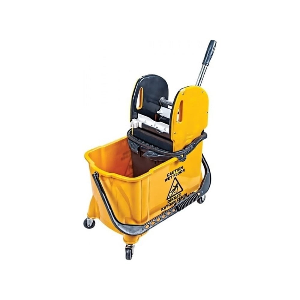 Одноведерная уборочная система на колесах. Включает пластиковое ведро 24 л, усиленный пластиковый отжим, под отжимом размещено маленькое ведро 6 л для грязной воды, колеса. Предназначена для профессиональной уборки в отелях, местах общественного питания, учебных и медицинских учреждениях, офисах, магазинах и т.д. Позволяет легко перемещать ведро с водой, экономя время и усилия.