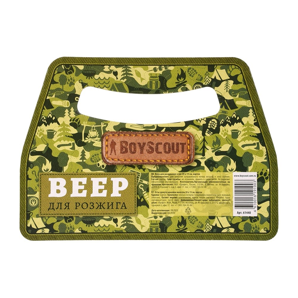 Картонный веер для раздувания огня BOYSCOUT 61440 применяется в походных условиях. Предназначен для создания потока воздуха в зоне горения. Изготовлен из картона и имеет размер 210х3х150 мм.