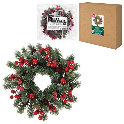 Материал – 100% литой ПЭТ. Цвет хвои – зелёный, заснеженный. Венок из литого ПЭТ украшен ветками красных ягодок, пластиковыми красными шарами и шишками. Венок выглядит, как натуральный, и создает особую праздничную атмосферу. На задней части основания венка расположено отверстие, за которое можно легко повесить венок на стену или дверь. Можно разместить не только на вертикальную, но и на горизонтальную поверхность, сделав частью новогоднего украшения.