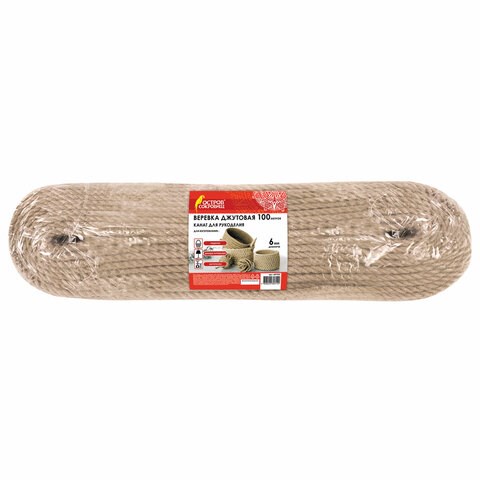 Веревка обладает высокой прочностью, устойчива к истиранию, негативному воздействию ультрафиолета и резкому перепаду температур. Она достаточно мягкая, имеет равномерную витую структуру без посторонних включений, не ворсится и не колется. Джутовая веревка широко применяется для создания предметов интерьера: кресел, абажуров, кашпо, вязания ковриков, корзин, отлично подходит для изготовления когтеточек. Также веревка успешно используется в приусадебном хозяйстве, в быту, на строительных площадках и в производстве. Длина веревки - 100 м, диаметр нити - 6 мм. Каждый отрезок веревки упакован в термоусадочную пленку.