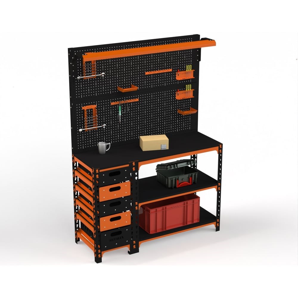 Верстак подойдет для небольшой мастерской или производственного помещения. Помимо самой столешницы имеется: 2 полки, 2 перфопанели, комплект аксессуаров и 5 ящиков для рационального хранение различных предметов (мелких деталей, документации, инструментов). Модель оснащена комплектом освещения, который обеспечивает комфортную работу пользователя. Используется в качестве дополнительного оборудования для верстаков. Используется для организации рабочих мест на производствах, на складах, в гаражах, мастерских, автосервисах и на других объектах. Предназначен для слесарных и сборочных работ. Крепление: комбинированное. Не используются шарико-телескопические направляющие, ящики выдвигаются на основе металлических направляющих толщиной 2 мм, что позволяет увеличить нагрузку на ящики и их долговечность. Верстак выполнен: Столешница и полки из стали толщиной 1,5 мм Траверсы и стойки из стали толщиной - 2 мм Перфопанели - 0,8 мм Максимум распределённой нагрузки на весь верстак составляет до 350 кг. Максимум распределённой нагрузки на полку составляет до 100 кг. Крепление безболтовое. Цвет: оранжево-чёрный.