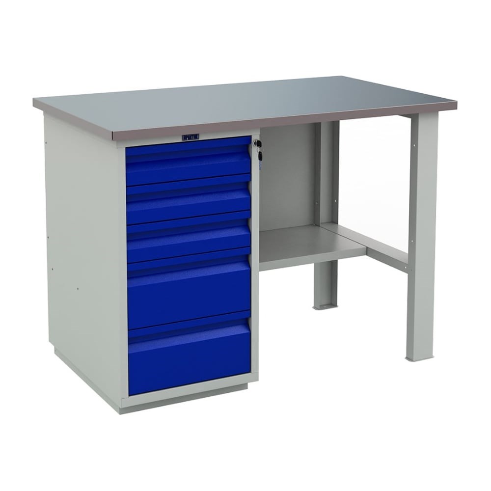 Верстак ПРАКТИК WT120.WD5/F1.000 S30399505246 позволяет оборудовать комфортное рабочее место для работника сборочного производства. 5 ящиков обеспечивают упорядоченное хранение личных вещей и рабочего инструмента. Телескопические направляющие гарантируют легкое выдвижение ящиков, максимальная нагрузка на каждый составляет 30 кг. Жесткая столешница (МДФ толщиной 24 мм и оцинкованный металл толщиной 1.2 мм) не прогибается под нагрузкой. Модель покрыта порошковой краской серый шагрень RAL 7038 (корпус) и синий шагрень RAL 5002 (передняя панель ящиков).