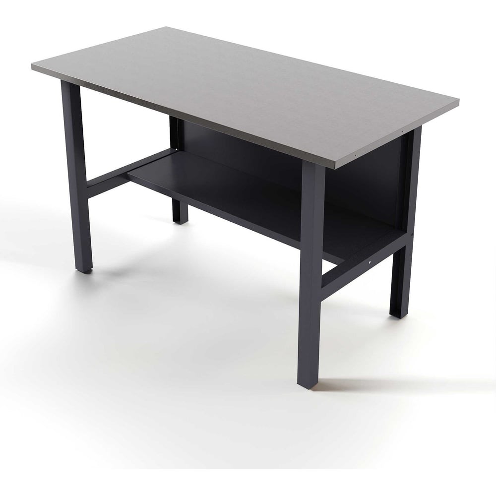 Верстак-стол - устойчивый, удобный, для слесарных, столярных работ, для производств и мастерских. Поставляется в разобранном виде. Крепкая и надежная конструкция столешницы из дерева и металла выдерживает нагрузку до 300 кг. Специальное полимерное покрытие на опорах и полке защищает от коррозии и придает столу эстетичный вид. Надежная и прочная конструкция стола , позволяет выполнять даже силовые операции с инструментом и металлоизделиями. Столешница представляет собою плиту из фанеры толщиной 24 мм, закрытую коробом из оцинкованного листа толщиной 1, 2 мм. Конструкции столешницы и короба разработаны таким образом, чтобы после сборки верстака на его рабочей поверхности отсутствовали неиспользуемые отверстия для крепежных элементов, головки болтов, заклепок и т. д. Поверхность наших столешниц идеально ровная. Это обеспечивает дополнительный комфорт пользователю. Опора для верстаков и столов из холоднокатаной стали 1, 5 мм согнутой в П-образный профиль. Цвет серый RAL 7024.
