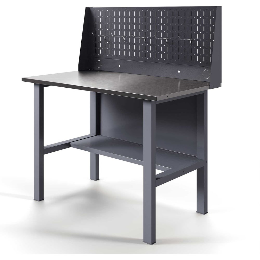 Верстак-стол - устойчивый, удобный, для слесарных, столярных работ, для производств и мастерских. Поставляется в разобранном виде. Крепкая и надежная конструкция столешницы из дерева и металла выдерживает нагрузку до 300 кг. Специальное полимерное покрытие на ножках и полке защищает от коррозии и придает столу эстетичный вид. Надежная и прочная конструкция стола , позволяет выполнять даже силовые операции с инструментом и металлоизделиями. Столешница представляет собою плиту из фанеры толщиной 24 мм, закрытую коробом из оцинкованного листа толщиной 1,2 мм. Конструкции столешницы и короба разработаны таким образом, чтобы после сборки верстака на его рабочей поверхности отсутствовали неиспользуемые отверстия для крепежных элементов, головки болтов, заклепок и т. д. Поверхность столешниц идеально ровная. Это обеспечивает дополнительный комфорт пользователю. Опора для верстаков и столов из холоднокатаной стали 1,5 мм. согнутой в П-образный профиль. Цвет серый RAL 7024. Перфорированная панель служит для размещения инструментов, крепежа и расходных материалов. Отверстия имеют диаметр 5 мм с шагом перфорации 50 мм. Перфорированная панель комплектуется дополнительной панелью для установки розеток, тумблеров и выводов компрессора.