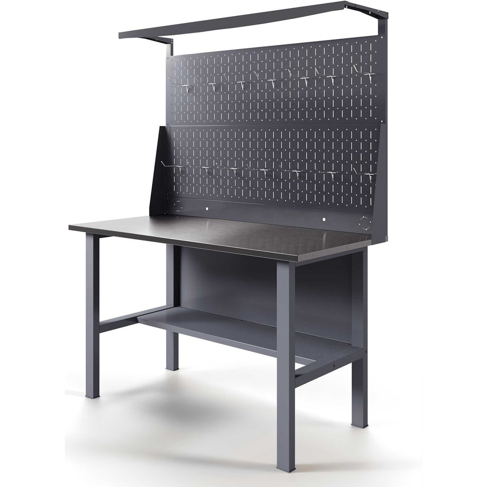 Верстак-стол - устойчивый, удобный, для слесарных, столярных работ, для производств и мастерских. Поставляется в разобранном виде. Крепкая и надежная конструкция столешницы из дерева и металла выдерживает нагрузку до 300 кг. Специальное полимерное покрытие на ножках и полке защищает от коррозии и придает столу эстетичный вид. Надежная и прочная конструкция стола , позволяет выполнять даже силовые операции с инструментом и металлоизделиями. Столешница представляет собою плиту из фанеры толщиной 24 мм, закрытую коробом из оцинкованного листа толщиной 1,2 мм. Конструкции столешницы и короба разработаны таким образом, чтобы после сборки верстака на его рабочей поверхности отсутствовали неиспользуемые отверстия для крепежных элементов, головки болтов, заклепок и т. д. Поверхность столешниц идеально ровная. Это обеспечивает дополнительный комфорт пользователю. Опора для верстаков и столов из холоднокатаной стали 1,5 мм, согнутой в П-образный профиль. Цвет серый RAL 7024. Перфорированная панель служит для размещения инструментов, крепежа и расходных материалов. Отверстия имеют диаметр 5 мм с шагом перфорации 50 мм. Перфорированная панель комплектуется дополнительной панелью для установки розеток, тумблеров и выводов компрессора, а так же козырьком для установки лампы освещения.