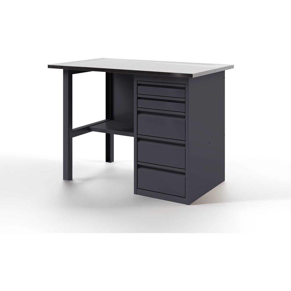 Верстак-стол - устойчивый, удобный, для слесарных, столярных работ, для производств и мастерских. Поставляется в разобранном виде. Крепкая и надежная конструкция столешницы из дерева и металла выдерживает нагрузку до 300 кг. Специальное полимерное покрытие на тумбах и полке защищает от коррозии и придает столу эстетичный вид. Надежная и прочная конструкция стола , позволяет выполнять даже силовые операции с инструментом и металлоизделиями. Столешница представляет собою плиту из фанеры толщиной 24мм, закрытую коробом из оцинкованного листа толщиной 1, 2 мм. Конструкции столешницы и короба разработаны таким образом, чтобы после сборки верстака на его рабочей поверхности отсутствовали неиспользуемые отверстия для крепежных элементов, головки болтов, заклепок и т. д. Поверхность наших столешниц идеально ровная. Это обеспечивает дополнительный комфорт пользователю. Опора для верстаков и столов из холоднокатаной стали 1, 5 мм. согнутой в П-образный профиль. Цвет серый RAL 7024.
