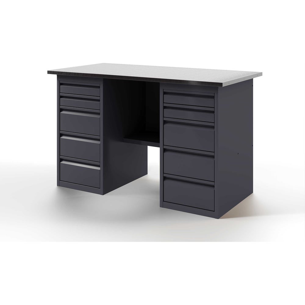 Верстак-стол - устойчивый, удобный, для слесарных, столярных работ, для производств и мастерских. Поставляется в разобранном виде. Крепкая и надежная конструкция столешницы из дерева и металла выдерживает нагрузку до 300 кг. Специальное полимерное покрытие на тумбах и полке защищает от коррозии и придает столу эстетичный вид. Надежная и прочная конструкция стола , позволяет выполнять даже силовые операции с инструментом и металлоизделиями. Столешница представляет собою плиту из фанеры толщиной 24мм, закрытую коробом из оцинкованного листа толщиной 1, 2 мм. Конструкции столешницы и короба разработаны таким образом, чтобы после сборки верстака на его рабочей поверхности отсутствовали неиспользуемые отверстия для крепежных элементов, головки болтов, заклепок и т. д. Поверхность наших столешниц идеально ровная. Это обеспечивает дополнительный комфорт пользователю. Опора для верстаков и столов из холоднокатаной стали 1, 5 мм. согнутой в П-образный профиль. Цвет серый RAL 7024.