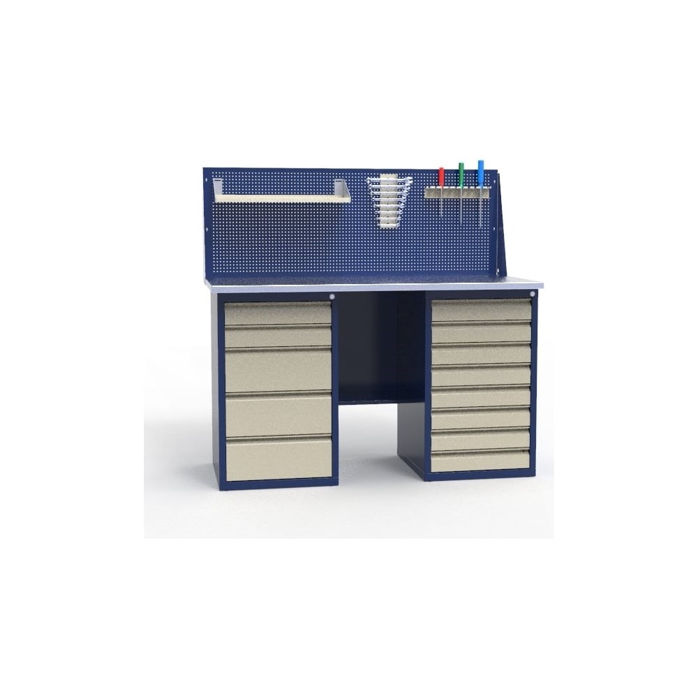 Верстак Святогор – это рабочий стол для слесарей. Он выдерживает большую нагрузку: до 1 тонны. Модель подойдет для использования в мастерских, автомастерских и на заводах, где к слесарным верстакам применяются особые требования по нагрузке. Все детали, изготовленные из холоднокатаной стали толщиной 1 мм, окрашены порошковыми эпокси-полиэфирными глянцевыми красками, что позволяет легко удалять загрязнения с поверхности. Столешница выполнена из фанеры толщиной 21 мм и оцинкованного листа толщиной 2 мм. В тумбе с выдвижными ящиками установлены шариковые телескопические направляющие, обеспечивающие плавное выдвижение.