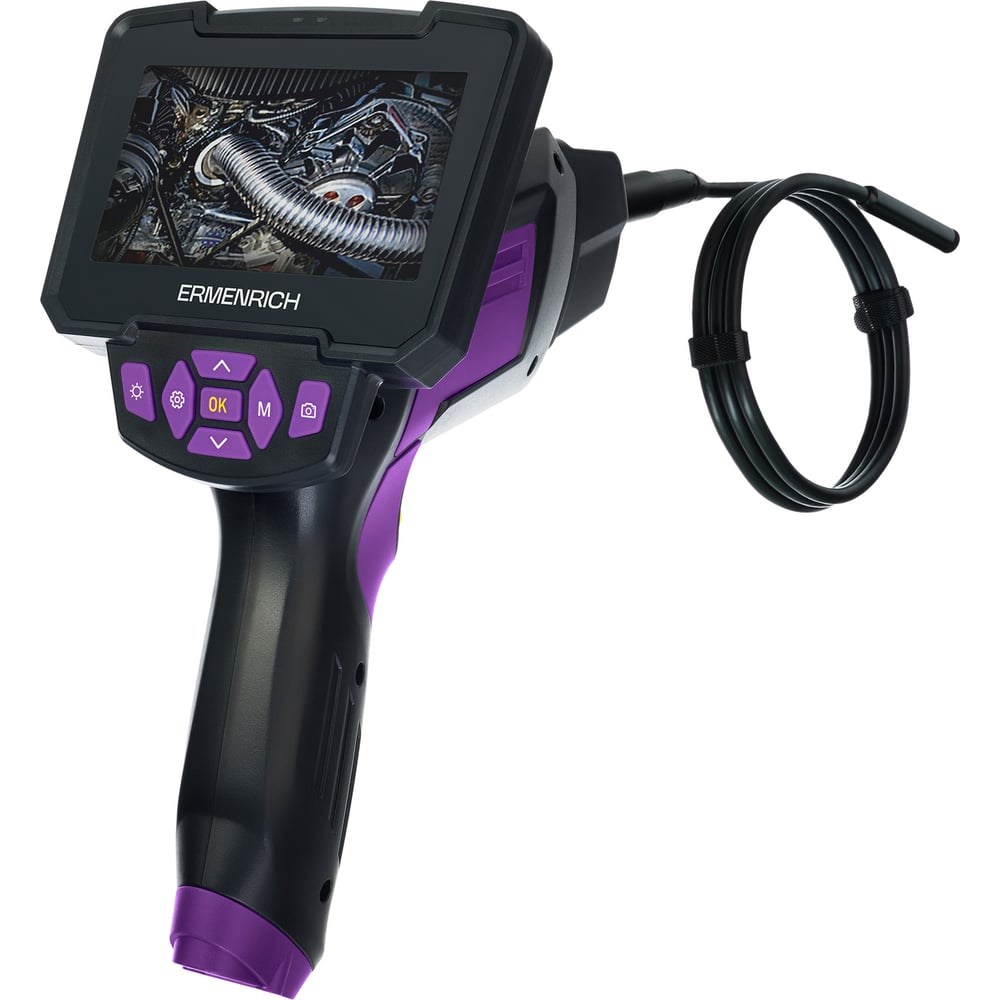 Эндоскоп Ermenrich Seek VE50 с одной камерой прямого обзора и полужестким кабелем длиной 10 м. Диаметр камеры всего 5,5 мм, и она легко проходит в труднодоступные места. Угол обзора составляет 70°, благодаря подсветке 6 светодиодами изображение получается четким. Эндоскоп рекомендуется использовать для диагностики канализационных и вентиляционных труб, осмотра стен на наличие трещин, выявления неисправностей в промышленном оборудовании. Степень герметичности камеры IP67, поэтому можно осматривать объекты под водой, например, при аварийном ремонте канализации или водопровода. Изображение выводится на цветной LCD-дисплей с диагональю 4,3". Перемещаться по меню можно с помощью кнопок на панели управления. Здесь же расположена кнопка для настройки яркости подсветки. В эндоскопе есть функции съемки фото с разрешением 1280x720 пикс и записи видео с разрешением 640x480 пикс. Для фото- и видеосъемки предусмотрена отдельная кнопка. Дисплей зафиксирован на блоке с удобной нескользящей ручкой. Фотоснимки и видеозаписи сохраняются на карту памяти microSD объемом до 64 ГБ (не входит в комплект). Встроенный литий-ионный аккумулятор емкостью 1700 мАч работает автономно до 3 часов. АКБ подзаряжается через адаптер питания (нет в базовой комплектации). С эндоскопом поставляются полезные аксессуары: зеркало для бокового обзора, крюк для подвешивания, магнит для крепления на металлическую поверхность и крышка для защиты оптики от грязи и от царапин.
