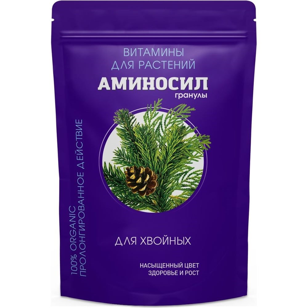 Витамины АМИНОСИЛ для хвойных гранулах помогают обеспечить здоровый рост хвойных, увеличивают их зеленую массу и улучшают общее состояние. Продукт обладает специальным составом, который обеспечивает передачу питательных веществ прямо в корневую систему. Витамины АМИНОСИЛ для хвойных в гранулах:дают комплексное питание;улучшают обмен веществ за счет высокого содержания аминокислот;способствуют росту и развитию корневой системы, а также лучшей приживаемости после пересадки;усиливают вегетацию и защищают от пожелтения хвои;повышают устойчивость к вредным воздействиям окружающей среды и к погодным условиям;улучшают декоративность хвойных растений в условиях минимального ухода;имеют 100% органический состав - безопасны для людей и животных.Витамины для хвойных АМИНОСИЛ идеально подходят для ухода, питания и удобрения хвойных растений всех видов: сосна, ель, туя, можжевельник, кедр, пихта, кипарис и другие. РАСХОД И ПЕРИОД ПРИМЕНЕНИЯ: 1 горсть ~ 30 г Укоренение саженцев - 60 г на м2 Регулярная подкормка - 30 г на м21 раз в в период с апреля по май для стимуляции роста и улучшения качества и цвета хвои;1 раз в период с середины августа и до первой половины октября для улучшения зимостойкости.Регулярное питание:равномерно распределить гранулы по поверхности грунта;заделать в почву на глубину до 5 см или присыпать новым грунтом;тщательно полить грунт.Состав: Азот - 6%, Фосфор - 4%, Калий - 8%, магний, железо, кальций, медь, цинк, марганец, сера, бор, молибден