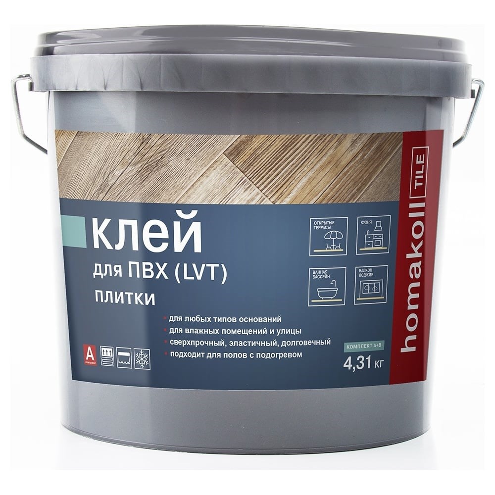 Влагостойкий клей для ПВХ и LVT плитки Homakoll Tile 2K PU, 4.31 кг 467629 предназначен для надежной фиксации напольных модульных ПВХ-покрытий (LVT, кварц-винил). Состав подходит для всех типов оснований (впитывающие, невпитывающие). Продукт используют внутри и снаружи помещений с высоким уровнем влажности (бассейны, ванные, кухни, балконы, открытые террасы).