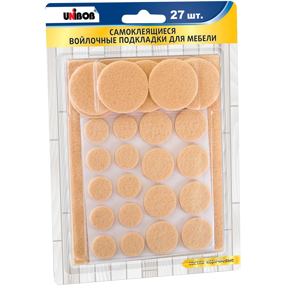 Самоклеящиеся войлочные подкладки для мебели Unibob светло-коричн., упак. 27 шт. 214952 предназначены для защиты напольных покрытий от повреждений и царапин ножками мебели. Подкладки могут применяться как в офисе, так и дома. Материал основы: войлок. Материал клеевого слоя: на основе синтетического каучука.