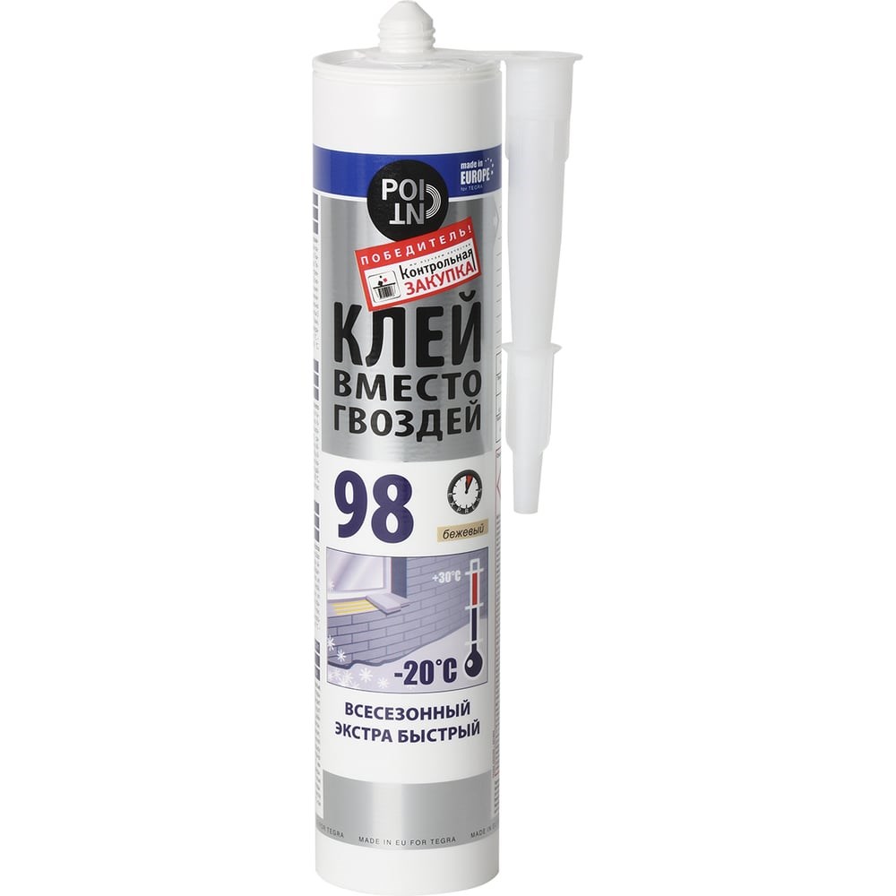 Всесезонный экстра быстрый клей вместо гвоздей POINT 98 280 мл 03-1-0-098 используют во время монтажных и отделочных работ для приклеивания плинтусов, цоколей, порогов, панелей, керамической плитки, для склеивания декоративных элементов. Состав обеспечивает высокую липкость к большинству строительных материалов: бетон, кирпич, штукатурка, гипс, камень, дерево, металл, керамика, фанера, все виды пластика. Продукт применяют внутри и снаружи помещений при температуре от -20ºC до +30ºC. Эластичный клеевой шов обладает водоотталкивающими свойствами, быстрым первоначальным схватыванием, не сползает при вертикальном нанесении и обеспечивает надежную фиксацию деталей.