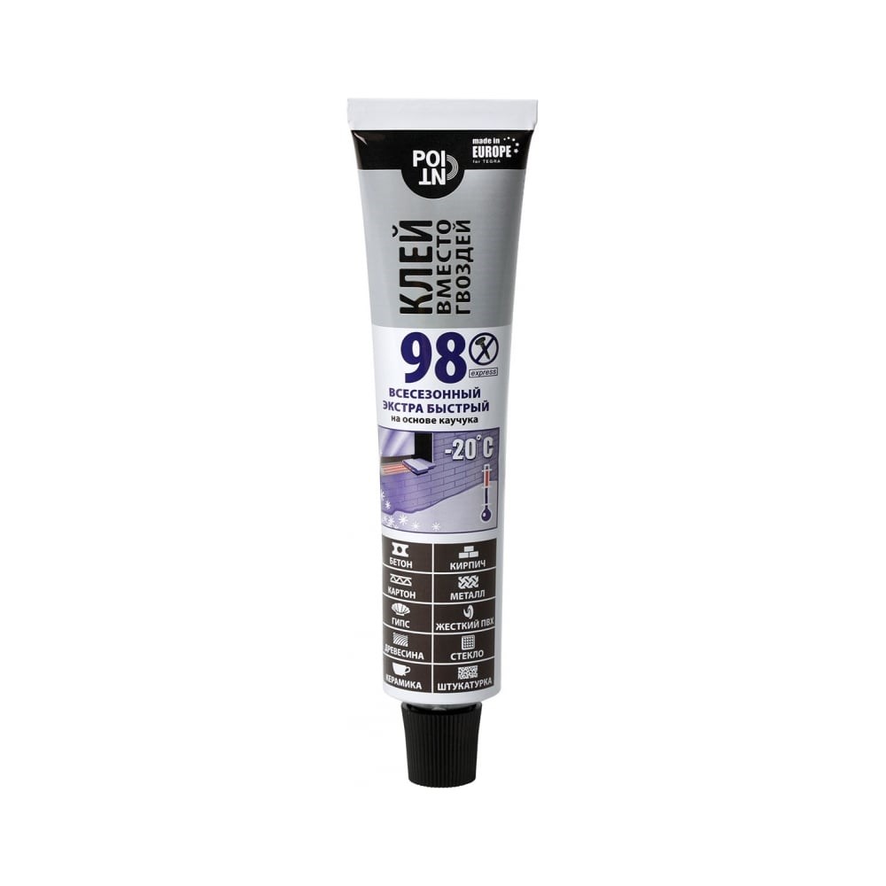 Клей вместо гвоздей POINT на основе каучука 98 Glue POINT в шоу-боксе, 80 мл 03-1-0-198 используют во время монтажных и отделочных работ для приклеивания плинтусов, цоколей, порогов, панелей, керамической плитки, для склеивания декоративных элементов. Состав обеспечивает высокую липкость к большинству строительных материалов: бетон, кирпич, штукатурка, гипс, камень, дерево, металл, керамика, фанера, все виды пластика. Продукт применяют внутри и снаружи помещений при температуре от -20ºC до +30ºC. Эластичный клеевой шов обладает водоотталкивающими свойствами, быстрым первоначальным схватыванием, не сползает при вертикальном нанесении и обеспечивает надежную фиксацию деталей.