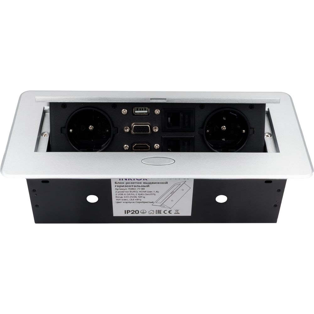Выдвижной встраиваемый блок розеток представляет собой металлический прямоугольный розеточный блок на 2 EURO розетки, 2 RJ45, 2 USB-А DATA, HDMI. При нажатии на кнопку на лицевой части розетки, происходит плавное открытие. Качественная порошковая окраска корпуса позволяет долгое время сохранить внешний вид нового изделия, розетка не царапается. Данная модель готова к эксплуатации вся внутренняя разводка уже сделана на заводе, в комплекте с сетевым шнуром длиной 1.8м, необходимо только подключить изделие к розетки. Выдвижные розетки отлично подходят для установки в столешницу на кухне. В закрытом положении встраиваемая розетка образует со столешницей практически ровную поверхность. Также выдвижные розетки нашли распространение в офисах, переговорный залах, стойках обслуживания клиентов.