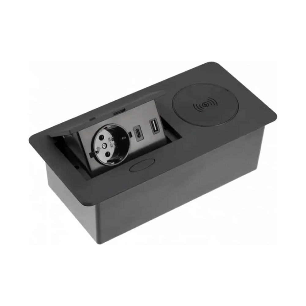 Выдвижной блок розеток SETE выдвижная розетка с 1 EURO розеткой, 2 USB, беспроводная зарядка, черная, SBT-1UCWT-20 отлично подходит для установки в столешницу на кухне, что помогает экономить рабочее пространство. В закрытом положении встраиваемая розетка образует со столешницей практически ровную поверхность.Дополнительные характеристики:Максимальная мощность: 3600 Вт.Врезное отверстие 128х108 мм.НапряжениеUSB: 5V, 2.1A.