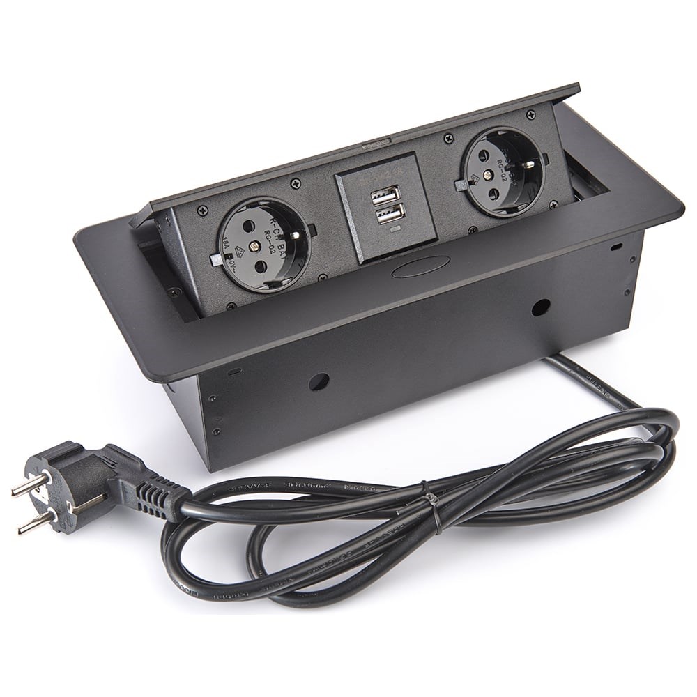 Выдвижной встраиваемый розеточный блок Inrior на 2 EURO розетки 2 USB-A, TORO-22-20 для столов и столешниц, кухни и офиса, навесных шкафов, мебели, черного цвета. Изготовлена полностью из металла, лицевая панель выполнена из алюминиевого сплава, установочная коробка и сопутствующие элементы из стали. Что положительно сказывается на надежности и долговечности конструкции. USB - 5V, 2.1A. Максимальная мощность: 2700 Вт. Скрытая розетка имеет стандарт влагозащиты IP20, однако предусмотрена начальная степень защиты от воды, на розетках установлены шторки, так же над поверхностью столешницы остается рамка 2 мм, которая предотвращает затекание воды внутрь механизма.