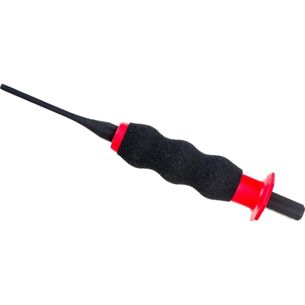 Выколотка с протектором (3х150 мм) KING TONY 76403-06G позволяет избежать отдачи при работе благодаря резиновому покрытию пластиковой рукояти. Материалом модели служит закаленный хром-ванадиевый сплав. Для устойчивости к сколам в материал добавляется молибден. Боек приспособления имеет диаметр 3 мм.