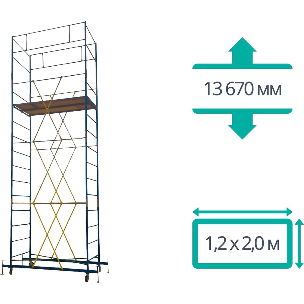 Функциональная строительная вышка-тура высокого качества ВСРП высотой 13670 мм подходит для проведения широкого перечня работ снаружи и внутри зданий и иных сооружений с общими нагрузками на конструкцию – 200 кг. При этом, подмости позволяют безопасно разместиться нескольким людям, что ускоряет и упрощает работу. Представленная модель состоит из прочных маршевых рам-лестниц, покрытых антикоррозийной краской. В процессе сборки данные несущие элементы устанавливаются друг на друга (с помощью гантелей) до наращивания предельной высоты. Жесткость конструкции обеспечивают диагонали. В домкратном основании находятся колеса, упрощающие перемещение вышки между объектами, на которых выполняются работы, а сами подмости дополняются стабилизаторами.