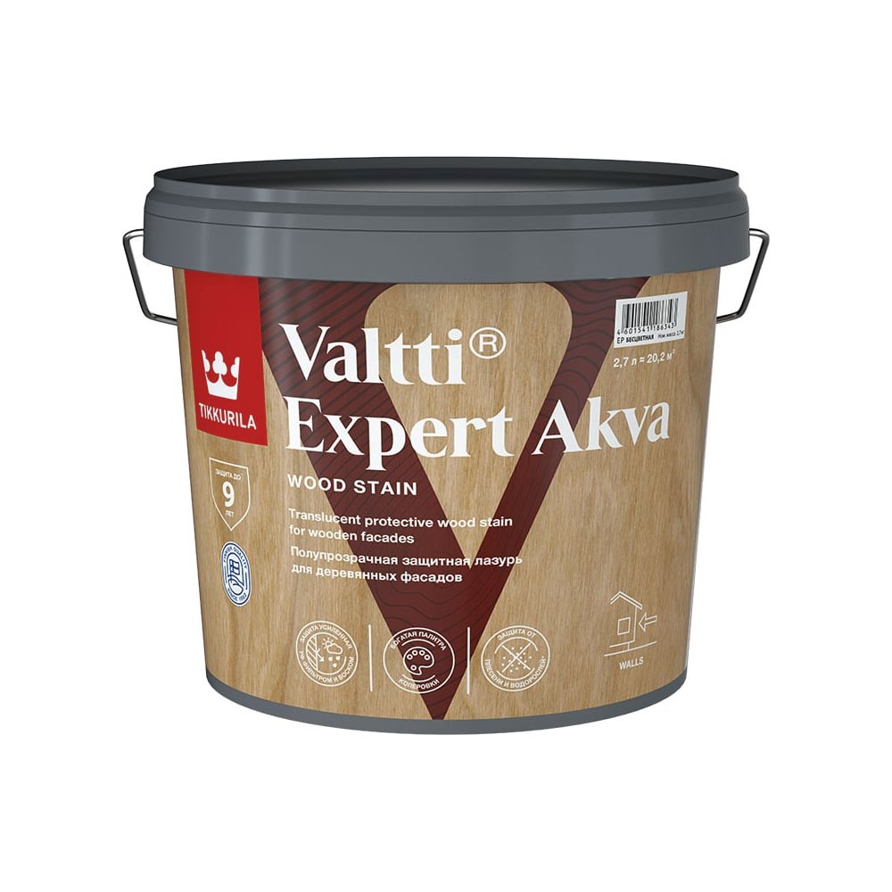 Высокоэффективная декоративно-защитная лазурь. Предназначена для отделки и защиты вертикальных деревянных поверхностей из вагонки, клееного бруса, строганных и пиленых дощатых фасадов, а также балок, перил, откосов, подверженных атмосферной нагрузке. Позволяет существенно продлить срок службы древесины и придает ей декоративный эффект, сохраняя ее структуру. Защищает от атмосферных нагрузок, замедляя воздействие влаги, УФ-излучения, синевы и плесени. Для максимально эффективной защиты необходимо комплексное использование биозащитной грунтовки Tikkurila Valtti Expert Base и лазури Tikkurila Valtti Expert Akva, особенно для нижних венцов зданий. Не рекомендуется наносить на бревно и свежий брус.