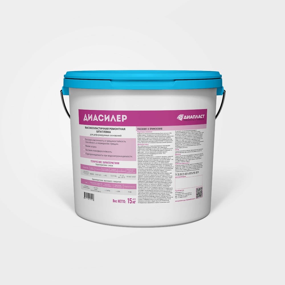 ДИАСИЛЕР представляет собой эластичную фасадную шпатлевку на основе сополимерной стирол-акриловой дисперсии, тонкодисперсного мраморного наполнителя и комплекса модифицирующих и микроармирующих добавок. Шпатлевка предназначена для выравнивания и сглаживания деформируемых и трещиноватых поверхностей, с относительной деформацией до 15%. Шпаклевка может перекрывать трещины с раскрытием до 1 мм. Более широкие и динамические трещины должны быть расшиты и заполнены, например, клеем-пеной до достижения относительной деформации полученной поверхности не более 15%. Основаниями для шпатлевки служат: пенополистирол, как обработанный защитными покрытиями, так и необработанный, полиуретановая клей-пена, дерево, минеральные основания (бетон, штукатурка, гипоскартон и т.п.). Состав применяется как внутри помещений, так и на фасадах.