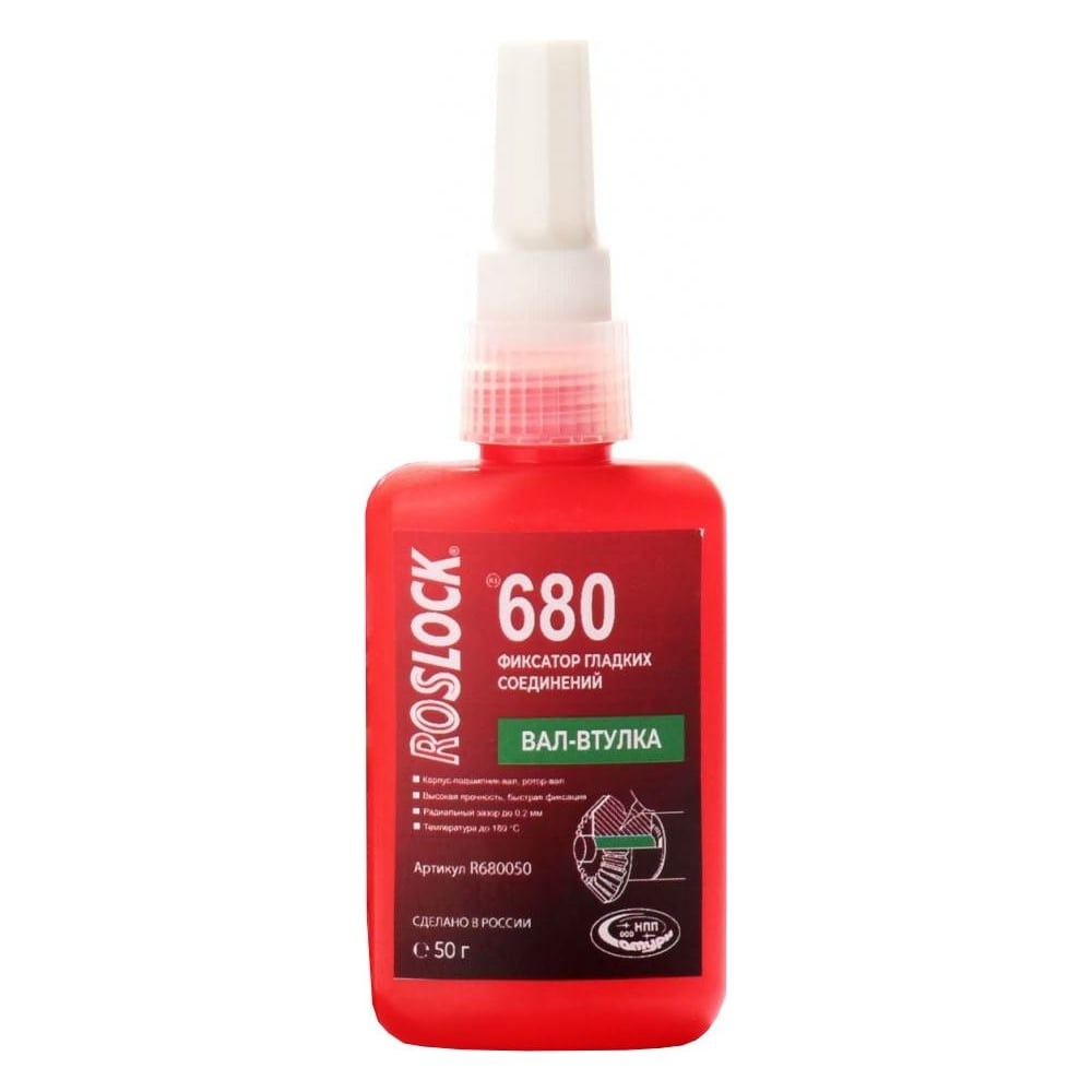Высокопрочный фиксатор ROSLOCK 680 для крепления подшипников, втулок, роторов к валам или втулок R680050 не рекомендуется для очень плотной посадки и посадки с натягом. Свойства жидкого герметика Химическая основа: диметакрилат Внешний вид: жидкость зеленого цвета Вязкость по Брукфильду RVТ, (A/3/20) при 25 °С по ГОСТ 25271: 700 – 1800 мПа*с Температура вспышки: > 153 °С, не содержит растворителей Набор прочности Болт-гайка М10х1,5-6g/6H из стали марки 30 при (18 - 25) °С по ISO 10964: Ручная прочность через (10 – 30) мин Ручная прочность с активатором - до 5 мин Функциональная прочность - через (3 – 6) ч Максимальная прочность - через 24 ч Свойства отвержденного герметика Выдерживает температуру -60 °С ... 180 °С (4 ч до 200 °С). Аксиальный сдвиг на стали марки 30 (Rz = 20 мкм) при (18 - 25) °С по ISO 10123:2013: Предел прочности через 24 ч: (15 – 20) МПа Отрыв на стали марки 30 (Rz = 20 мкм) через 24 ч при (18 - 25) °С по ГОСТ 14760: Предел прочности через 24 ч: не менее 30 МПа Болт-гайка М10х1,5-6g/6H из стали марки 30 ГОСТ 1050 при (18 - 25) °С по ISO 10964: Момент отвинчивания через 24 ч: (20 – 35) Н*м