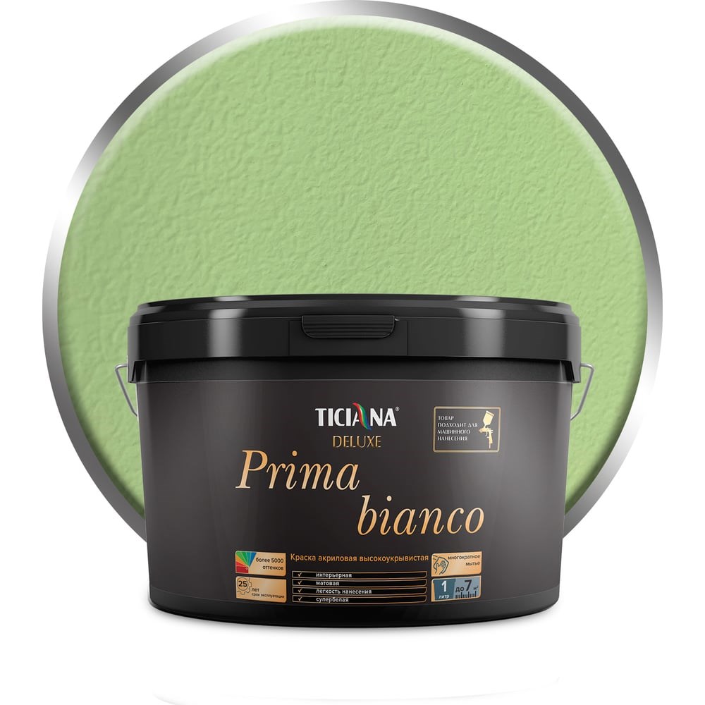 Акриловая краска TICIANA DELUXE Prima Bianco высокоукрывистая, база С, 2.5 л 4300005248 - это высококачественная краска на основе акриловой дисперсии для внутренних и наружных работ. Изготовлена по немецким технологиям на оборудовании фирмы Netzsch. Предназначена для окрашивания стен и потолков в жилых и общественных помещениях - бетонных, оштукатуренных, гипсокартонных, кирпичных и других минеральных поверхностей, а также для окрашивания фасадов зданий и сооружений. Компьютерная колеровка машинным способом или вручную универсальными колерами Ticiana Mix позволяет получить любой желаемый оттенок. Состав равномерно распределяется по основанию при помощи кисти, валик или краскораспылителя и образует полуматовое покрытие. База С не применяется без колеровки. Внимание! Фото может отличаться от товара, при выборе ориентируйтесь на технические характеристики.
