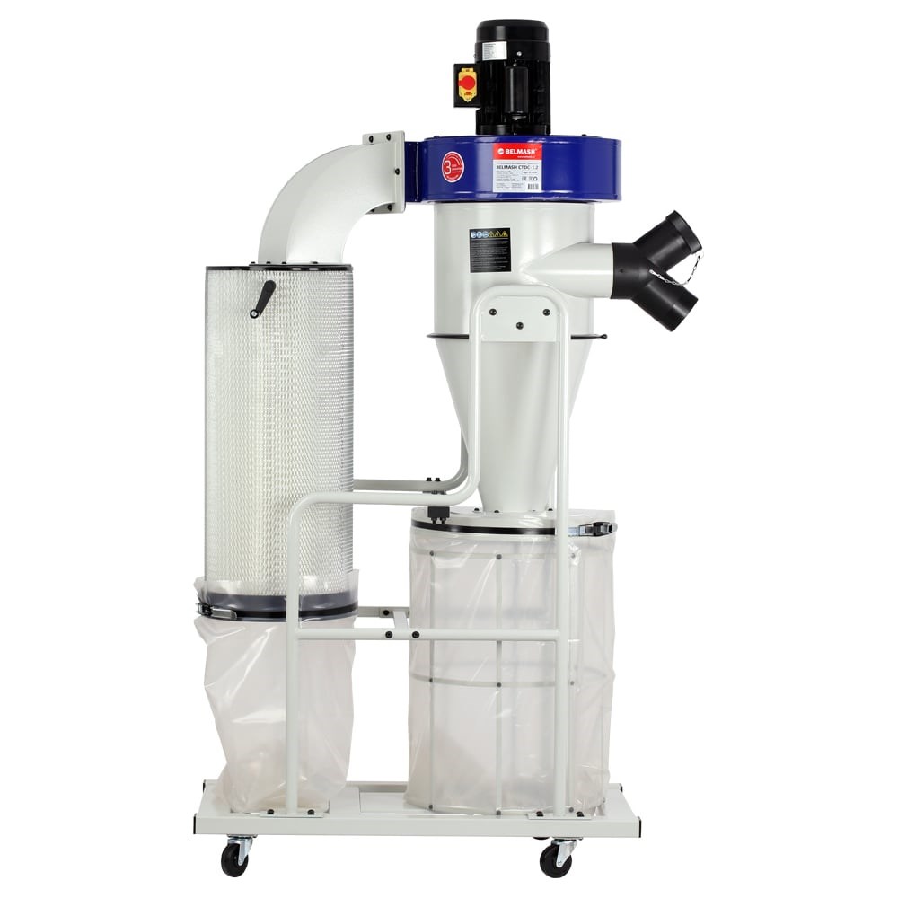 Вытяжная установка циклон Белмаш CTDC-1.2 D105A представляет собой оборудование для удаления древесных опилок и пыли. Работает от сети 220 В. Двухступенчатая система очистки обеспечивает высокую производительность. Также у данной модели предусмотрен раздельный сбор отходов. В мешок бункера попадают крупные частицы, а мелкие - в пылесборник под фильтр-катриджем. Дополнительные характеристики: Размер стружкосборника (ДхВ): 470x920 мм Уровень фильтрации: 1 мкм Частота вращения крыльчатки на холостом ходу: 2950 об./ мин Диаметр крыльчатки: 350 мм Разрежение воздуха: 2600 Па Диаметр входного патрубка: 125 мм Диаметр шланга подключения: 100 мм Количество входных патрубков адаптера переходного: 2 шт. Размер фильтрующего элемента: 340x800 мм Площадь фильтрующей поверхности: 3,5 кв. м.