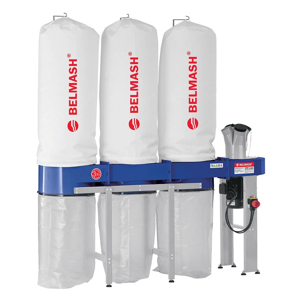 Вытяжная установка предназначена для удаления древесных опилок, стружки и пыли, образующихся в процессе деревообработки. Подходит ко всем деревообрабатывающим станкам (фуговальным, циркулярным, фуговально-рейсмусовым, рейсмусовым, шлифовальным и т.п.). Установка состоит из трех одинаковых секций. К разделительным корпусам зажимами крепятся фильтр-мешки сверху и стружкосборники – снизу. Все корпуса последовательно соединены между собой и с улиткой. Они установлены на общем основании с помощью кронштейнов и стоек. Для поддержания высокой производительности установка оснащена асинхронным двигателем мощностью 3800 Вт (режим работы S1). Рассчитана на подключение к трехфазной сети 400В.Крыльчатка, детали корпуса и адаптер выполнены из стали, что дает устойчивость к ударным нагрузкам. На входной патрубок вытяжки (Ø180 мм) устанавливается адаптер с четырьмя входами (Ø100 мм). Одновременно можно подключить четыре точки удаления отходов резания. Не задействованные патрубки закрываются крышками. Монтаж/демонтаж фильтр-мешков и мешков-стружкосборников не требует ни специального инструмента, ни большого количества времени, благодаря специальным зажимам. Фильтр-мешки очищаются без снятия, путем стряхивания пыли внутрь. Уровень очистки составляет 5 мкм, этого достаточно для работы не только с распиловочными и строгальными станками, но и с оборудованием, дающие мелкую взвесь – шлифовальными, фрезерными, рейсмусовыми станками. Три вместительных стружкосборника, объемом по 160 литров каждый.