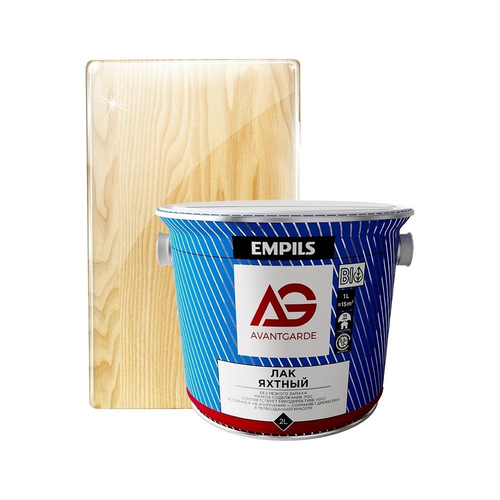 Яхтный лак Avantgarde высокой твердости, глянцевый, бесцветный, 2 л, 2.1 кг 77440 предназначен для защиты и декоративной отделки любых вертикальных и горизонтальных поверхностей из дерева и его производных (ДВП, ДСП, фанера, шпон, пробка и т. д.), в том числе деревянных элементов речных и морских судов выше ватерлинии, а также фасадов домов, оконных рам, заборов, садовой мебели, эксплуатируемых в условиях интенсивного атмосферного воздействия (осадков, солнечного излучения, перепадов температур) и внутри помещений. Продукт готов к применению, при необходимости разбавить водой, но не более 1 % от общей массы.