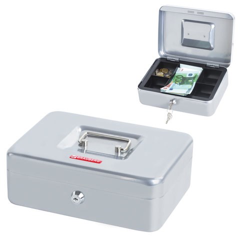 Ящик для денег, ценностей, документов, печатей, 90х180х250 мм, ключевой замок, серебристый, BRAUBERG, 291059