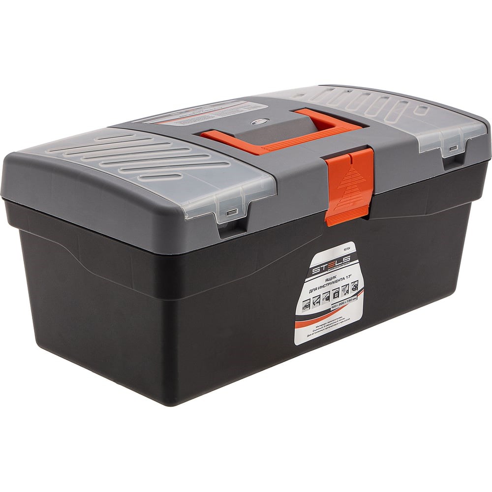 Ящик для инструмента Stels 90704 из пластика, длиной 17"", габаритами 420 х 220 х 180 мм, предназначен для переноски и хранения инструментов, хозяйственных мелочей, рыболовных снастей. Крышка надежно закрывается, поэтому содержимое не рассыплется. Встроенные в крышку отделения обеспечивают быстрый доступ к крепежам и другим необходимым предметам. Большой ящик для хранения инструментов будет полезен дома, на даче, в гараже и на рыбалке.