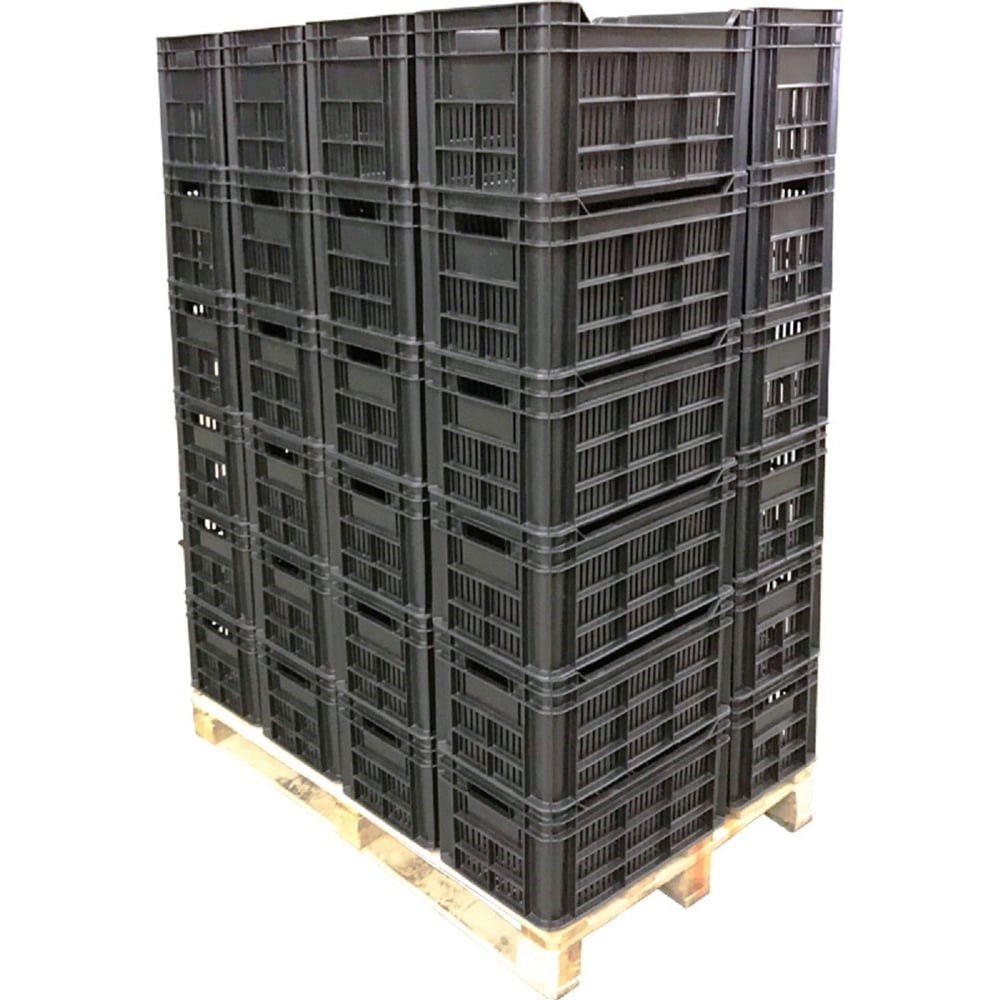 Ящик Тара.ру п/э 500x300x264, перфорированный, комплект 36 шт., чёрный 27007 подходит для хранения любых предметов: от бытовых вещей и продуктов питания до промышленных компонентов. Изделие выполнено из полиэтилена низкого давления. Дополнительные ребра жесткости позволяют максимально заполнить ящик без деформации. Форма позволяет вертикально складировать ящики без перекосов и использования систем хранения. Ящики поставляются на паллете - габариты 1200х800х1740 мм.