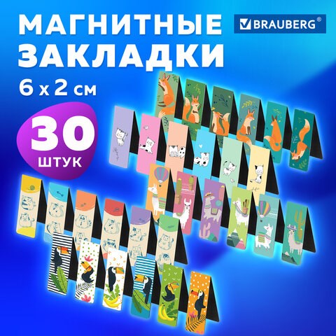 Закладки для книг МАГНИТНЫЕ, "ANIMALS", набор 30 шт., 60x20 мм, BRAUBERG, 113176