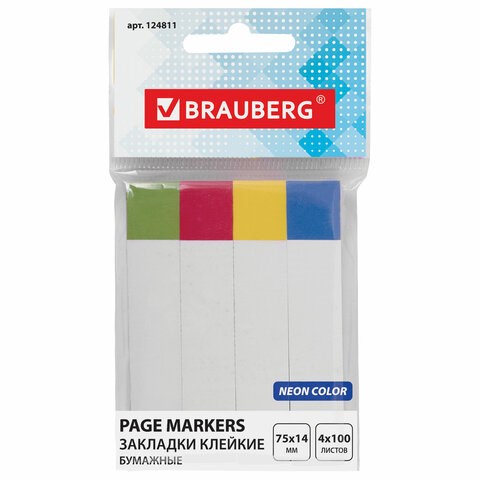 Закладки клейкие BRAUBERG бумажные, 75х14 мм, 400 штук (4 цвета х 100 листов), 124811