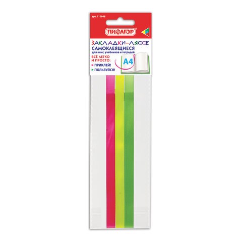 Закладки-ляссе "НЕОН" для книг А4 (длина 38 см) ПИФАГОР, клейкий край, 3 ленты, 111646