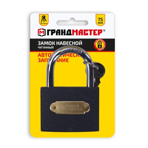 Замок навесной чугунный "Стандарт", ширина 75 мм, английский, 3 ключа, ГРАНДМАСТЕР, 671294