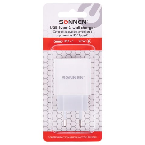 Зарядное устройство быстрое сетевое (220 В) SONNEN, Type-C PD 20 Вт, 3 A, белое, 455507