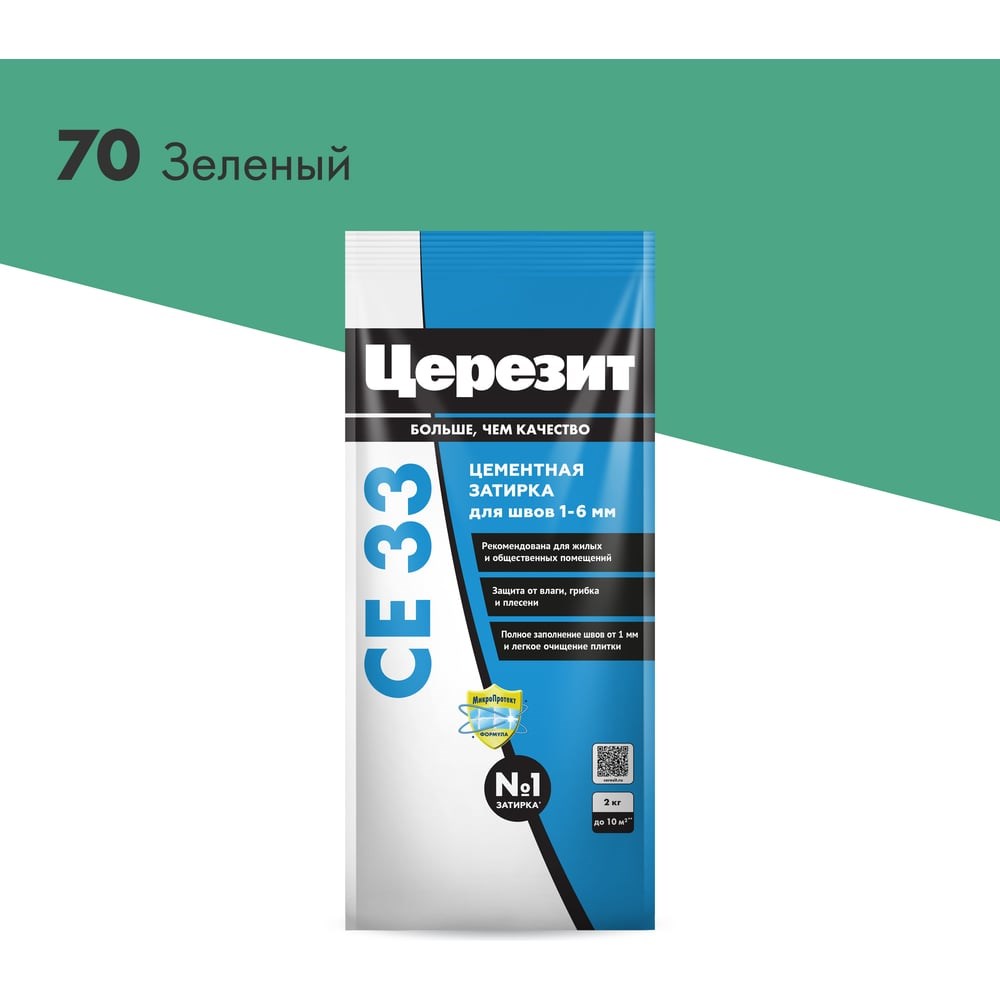 Затирка Церезит СE 33 зеленая №70 фольга 2 кг 1/12 48610 2092943 - цветной состав на цементной основе предназначен для заполнения швов керамических и каменных облицовок, устроенных на недеформирующихся основаниях (таких, как бетон, цементные стяжки и штукатурки), на полах и стенах, внутри и снаружи зданий, при ширине шва до 6 мм. Допускается использование для затирки швов в отделке бассейнов внутри помещений.Продукт обладает противогрибковым действием и пригоден для эксплуатации в условиях периодического увлажнения (в ванных комнатах,душевых, кухнях и т.п.) там, где не требуется химическая стойкость.