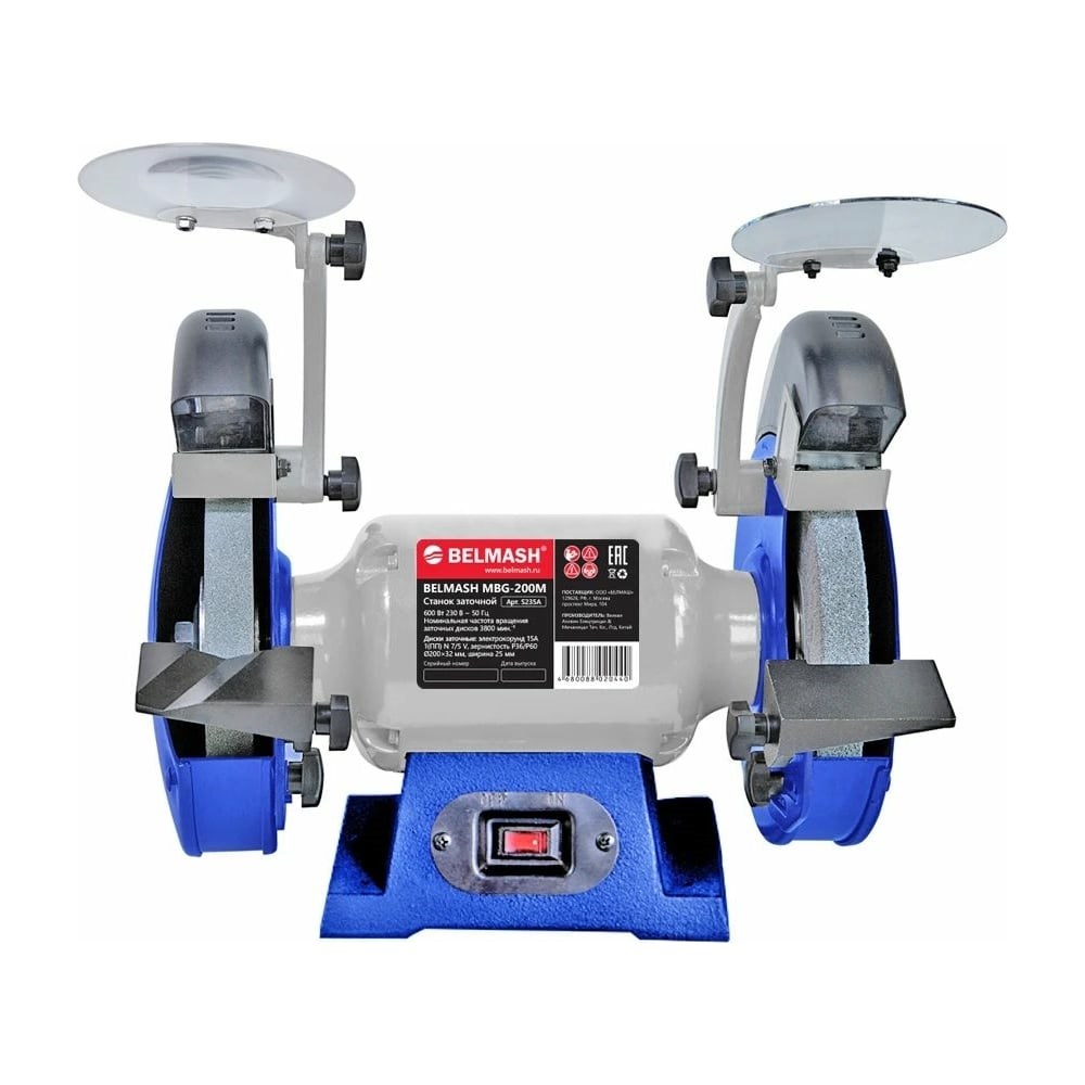 Заточной станок Белмаш MBG-200M S235A предназначен для затачивания режущих инструментов при помощи вертикально вращающихся заточных дисков. Модель оснащена асинхронным двигателем мощностью 600 Вт. По обе стороны от двигателя установлены заточные диски диаметром 200 мм и шириной 25 с различной зернистостью. Диски изготовлены из нормального электрокорунда (15А). Такой абразив используется для восстановления эксплуатационных свойств ручного инструмента, такого как ножи, топоры, стамески и т. п.; для снятия заусенцев, фасок, обдирки на небольших заготовках. Оба диска оснащены чугунными рабочими упорами (подручниками), защитными кожухами, узлами подсветки, искрозащитными экранами (один из них с линзой). Заточной диск на холостом ходу развивает скорость 3800 об/мин, что способствует высокой производительности модели. Чугунное основание станка снижает вибрацию. Имеются отверстия для крепления к верстаку.