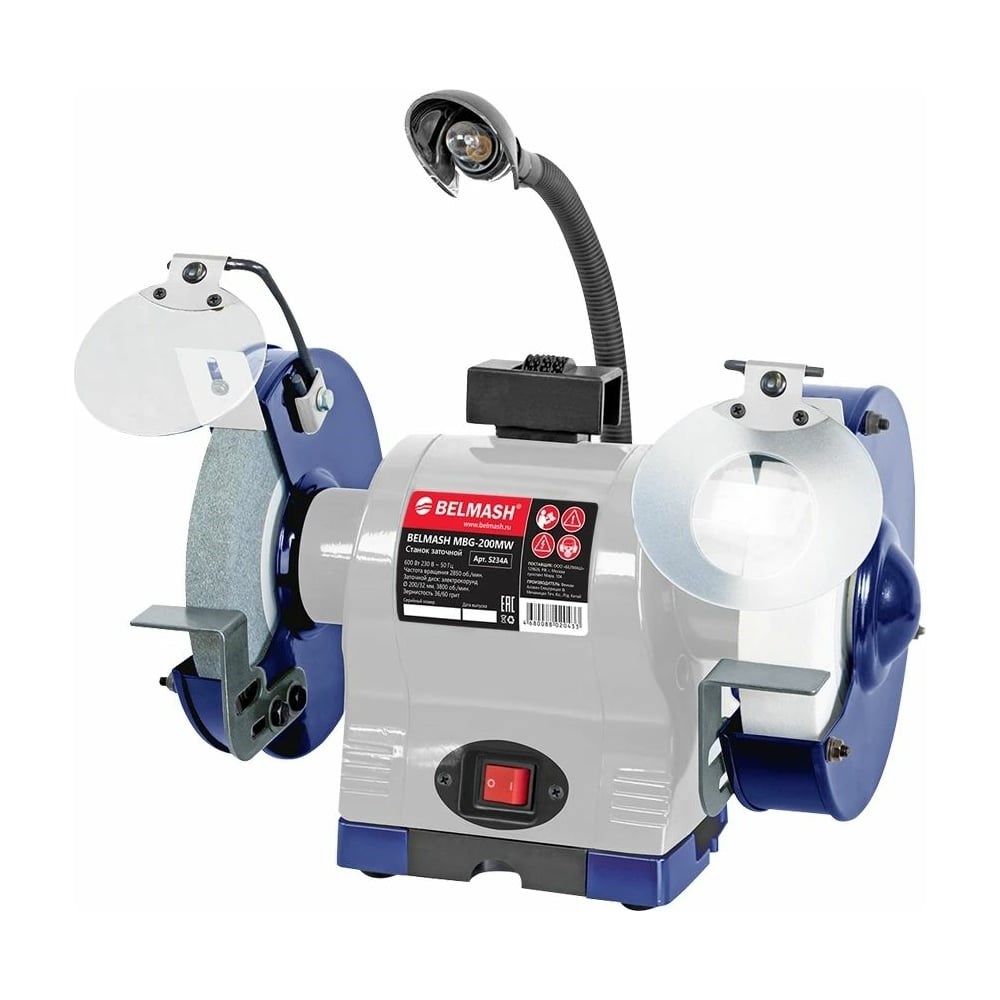 Заточной станок Белмаш MBG-200MW S234A предназначен для затачивания режущих инструментов при помощи вертикально вращающихся заточных дисков. Модель оснащена мощным асинхронным двигателем 600 Вт. По обе стороны от двигателя установлены заточные диски диаметром 200 мм и шириной 25 и 40 мм с различной зернистостью. Диски изготовлены из электрокорунда (нормальный 15А и белый 25А). Такой абразив используется для восстановления эксплуатационных свойств ручного инструмента, такого как ножи, топоры, стамески и т. п.; для снятия заусенцев, фасок, обдирки на небольших заготовках. Оба диска оснащены рабочими упорами (подручниками), защитными кожухами (листовая сталь), искрозащитными экранами (один из них с линзой). Заточной диск на холостом ходу развивает скорость 2850 об/мин, что способствует высокой производительности модели. На корпусе установлен регулируемый узел подсветки. В основании имеется отсек для хранения инструментов. Основание из литого алюминия обеспечивает высокую прочность конструкции.