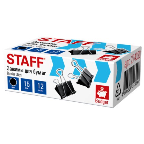 Зажимы для бумаг STAFF ECO, КОМПЛЕКТ 12 шт., 15 мм, на 45 листов, черные, картонная коробка, 274030