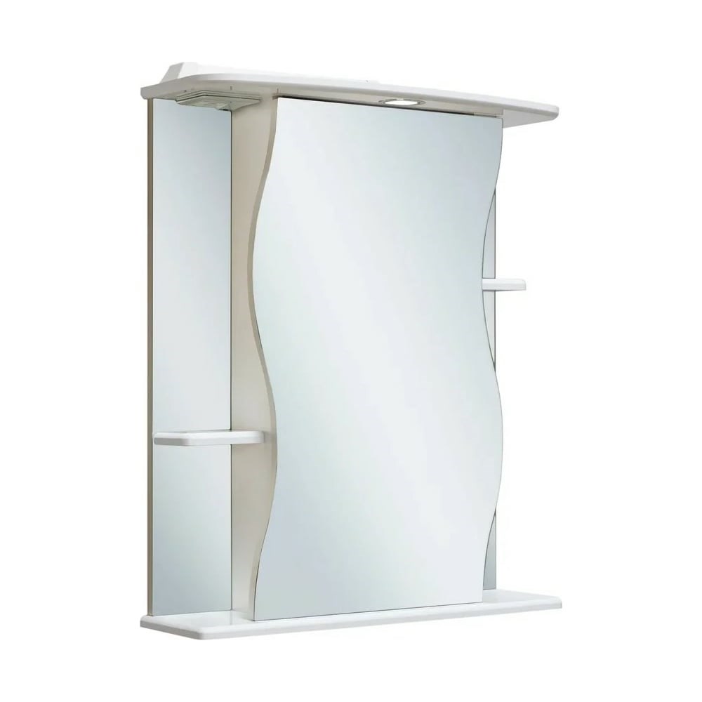 Зеркальный шкаф RUNO Лилия 60 правый 00000000029 имеет одну распашную фигурную дверцу с зеркальным фасадом, по бокам две открытые полки. Шкаф для ванной оборудован одним врезным светодиодным светильником 220 В, розеткой с выключателем, петлями со встроенным доводчиком.