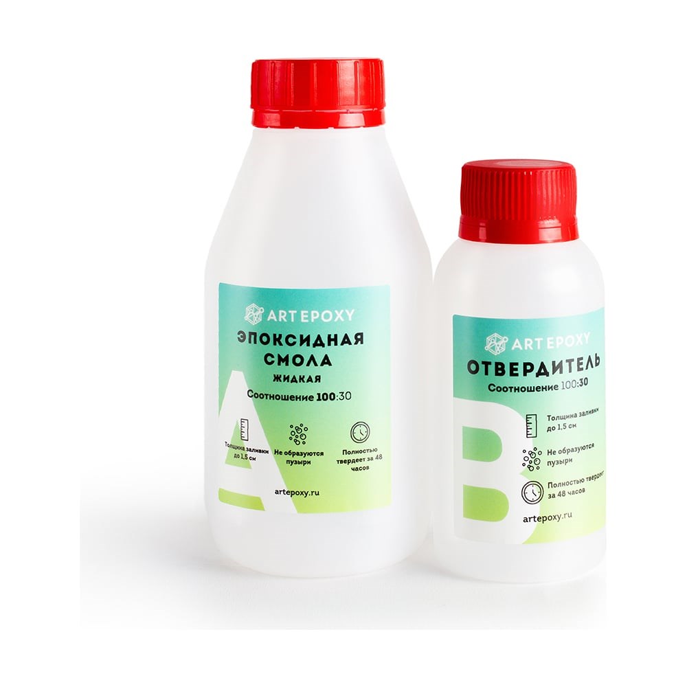 Жидкая эпоксидная смола ArtEpoxy 300 г ВИ-21592 широко используется для создания ювелирных украшений, картин, значков, заливки в молды (формы). Низковязкий состав абсолютно прозрачен. При отверждении происходит полный выход пузырьков воздуха. Покрытие высыхает за 48 часов при температуре 22-25°С. Продукт обеспечивает повышенную прочность готового изделия. Для придания более густого вида, смолу после смешивания необходимо оставить на 7-9 часов.