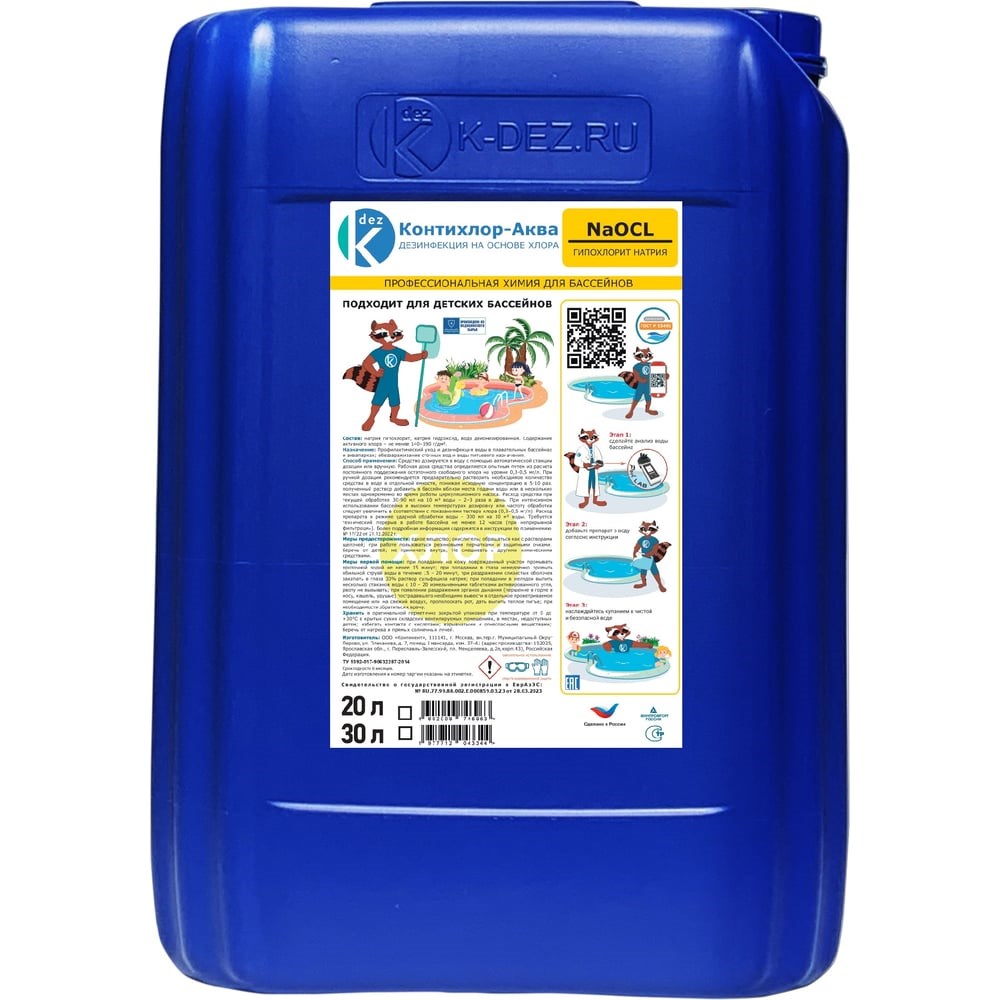Жидкий хлор для бассейна ООО Континен КОНТИХЛОР-АКВА 30 л 1977712043344 используется для профилактического ухода и дезинфекции воды в плавательных бассейнах и аквапарках; обеззараживание сточных вод и воды питьевого назначения. Отличается экономичным расходом, за счет чего средства хватит на долгий срок. Не содержит агрессивных ПАВ, благодаря чему безопасно для обрабатываемой воды. Средство полностью разлагаемо, поэтому не вредит окружающей среде. Применение: Средство дозируется в воду с помощью автоматической системы или вручную, согласно инструкции по применению № 17/14. Расход препарата определяется в соответствии с показателем уровня свободного хлора в воде бассейна, при этом необходимо постоянно производить контроль и корректировку содержания активного хлора в воде. Рабочая доза средства определяется опытным путем из расчета постоянного поддержания остаточного свободного хлора на уровне 0,3 - 0,5 мг/л. Меры предосторожности: Едкое вещество. Сильный окислитель. Обращаться как с растворами щелочей. При работе пользоваться резиновыми перчатками и защитными очками. Беречь от детей. Не смешивать с другими химическими средствами. При попадании на кожу или в глаза немедленно промыть большим количеством воды, при необходимости обратиться к врачу.