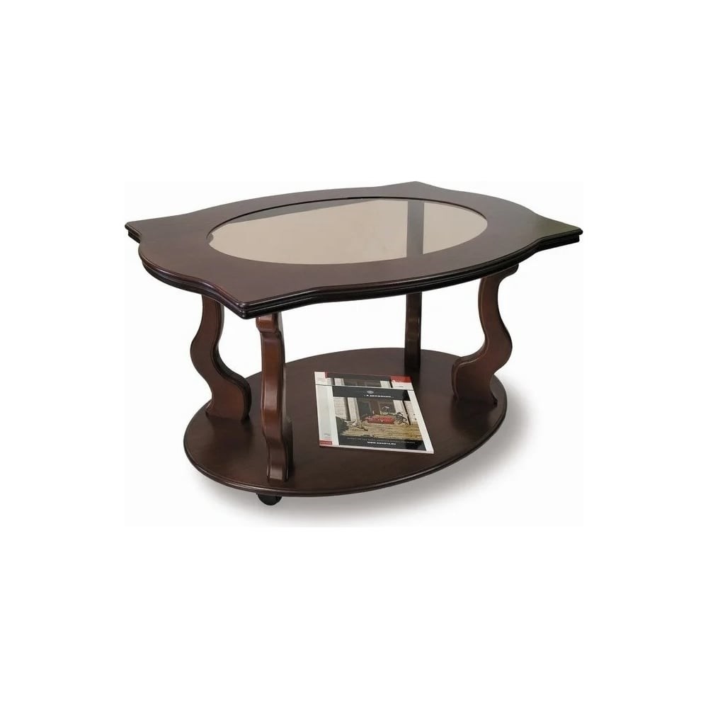 Классический столик в гостиную со стеклом Колесики позволяют легко передвигать столик, но не портят вид Большая полочка позволяет положить много журналов и газет Кромка столешницы имеет красивую форму, тонированное стекло Легко собирается, при сборке не нужен помощникМатериалы: лмдф, массив, стекло, эмаль, лак Упаковка: 98х62х9 см, 1место