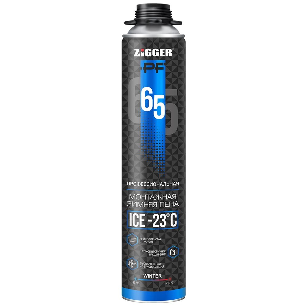 Пена ПРОФ ICE ZIGGER (65 л, -23C, 850 мл/920 гр, зимняя) 01-03-67 - однокомпонентная полиуретановая пена, предназначенная для монтажа окон, дверей, подоконников, стеновых панелей и других элементов при выполнении строительных и отделочных работ, а также герметизации, тепло – и звукоизоляции швов, щелей, пустот при температуре окружающей среды до -23 °С.