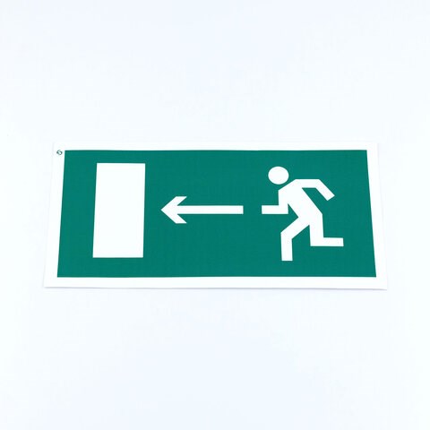 Знак указывает направление движения к эвакуационному выходу, который расположен с левой стороны относительно места установки знака. Устанавливается на стенах помещений для указания направления движения к эвакуационному выходу. Изготовлен в соответствии с ГОСТ 12.4.026-2015.