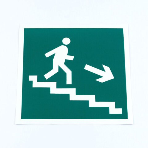 Эвакуационный знак "Направление к эвакуационному выходу по лестнице вниз, направо" применяется в качестве пиктограммы (наклейки) для световых эвакуационных указателей. Знак предназначен для размещения на лестничных площадках, а также стенах, прилегающих к лестничному маршу. Эвакуационный знак изготовлен на белой самоклеящейся пленке.