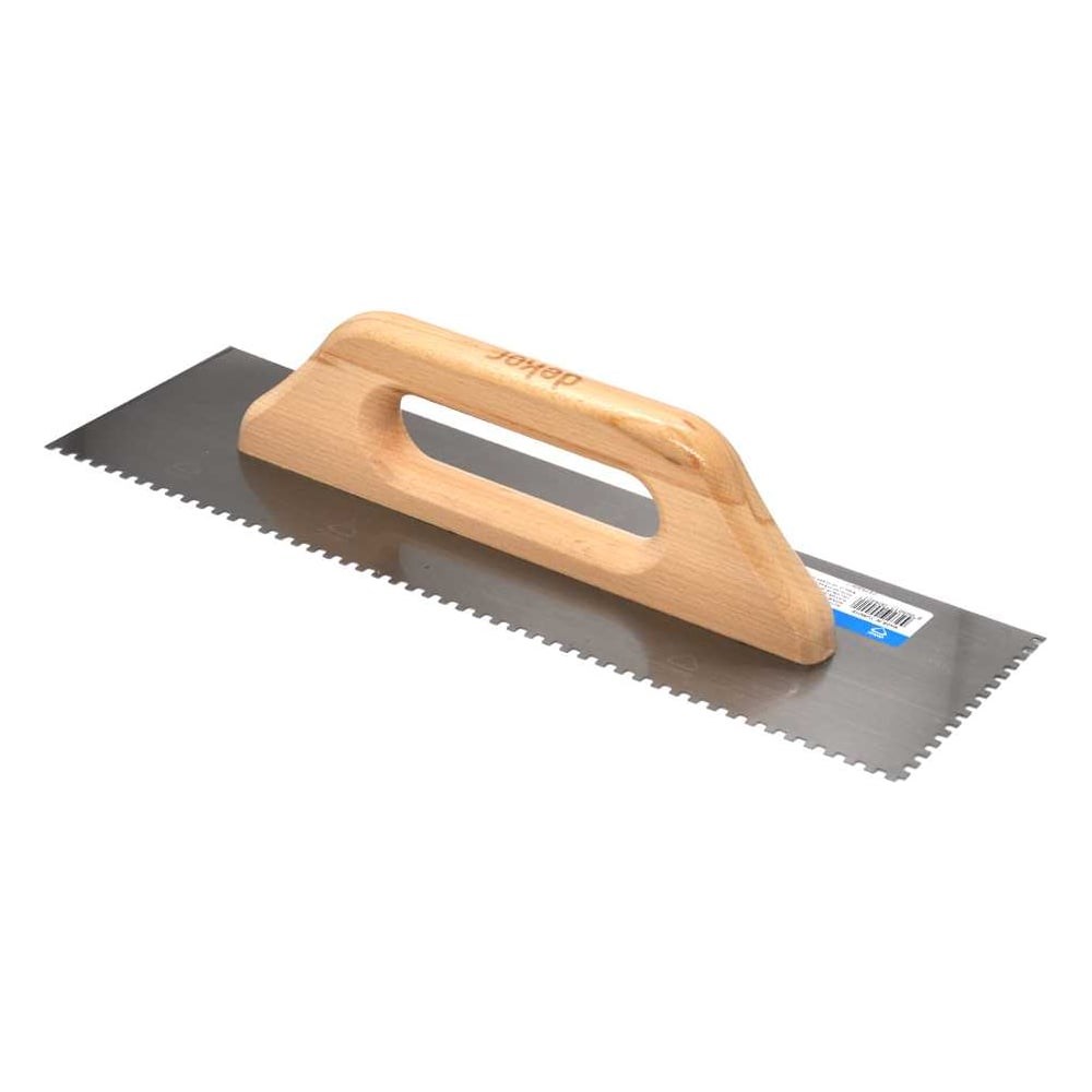 Зубчатая гладилка DEKOR HASSAN с деревянной ручкой 120 х 400 мм 442, квадратный зуб 4 х 4 мм, имеет увеличенную жесткость за счет двухстороннего крепления рукояти. Это позволяет равномерно распределять состав без утолщений и ровнее укладывать плитку. Данная гладилка сделана из пружинной стали.